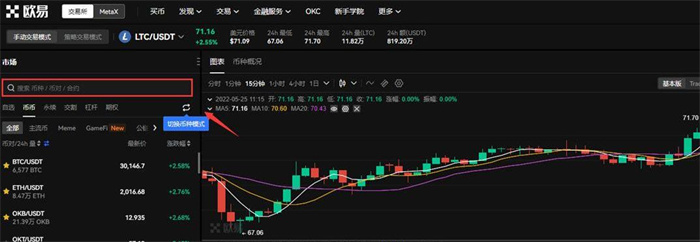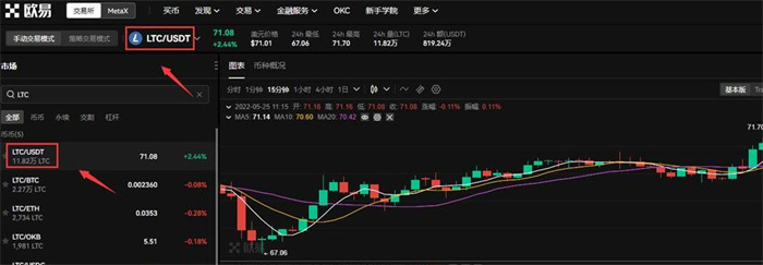 2. 在交易页面搜索框输入莱特币英文代码LTC。