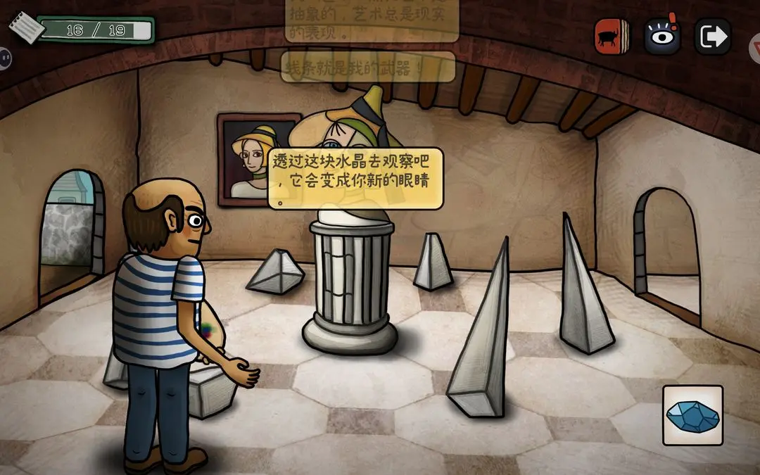 39、拼好后解锁【立体主义】成就,得到一块水晶,由对话得出需要拿水晶去看东西