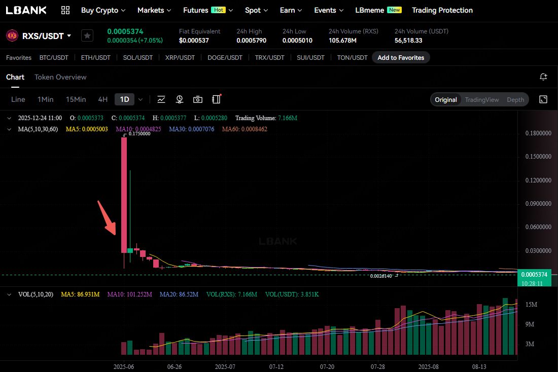 2025年6月上市后,RXS价格从预售末期的0.25美元暴跌至0.0005376美元。主要诱因包括代币集中释放、市场抛压激增,以及预售承诺与实际表现的巨大落差。