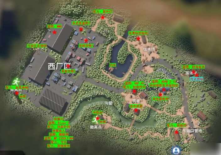 MMG(重火力武器)、防毒面具(应对后续毒雾区域)、ADAR 2-15(中期主力步枪)、UAF-45(抗电属性手枪)、Bizon-2(高弹容冲锋枪)、燃烧弹、MP-155ULTIMA(霰弹枪);配方类: