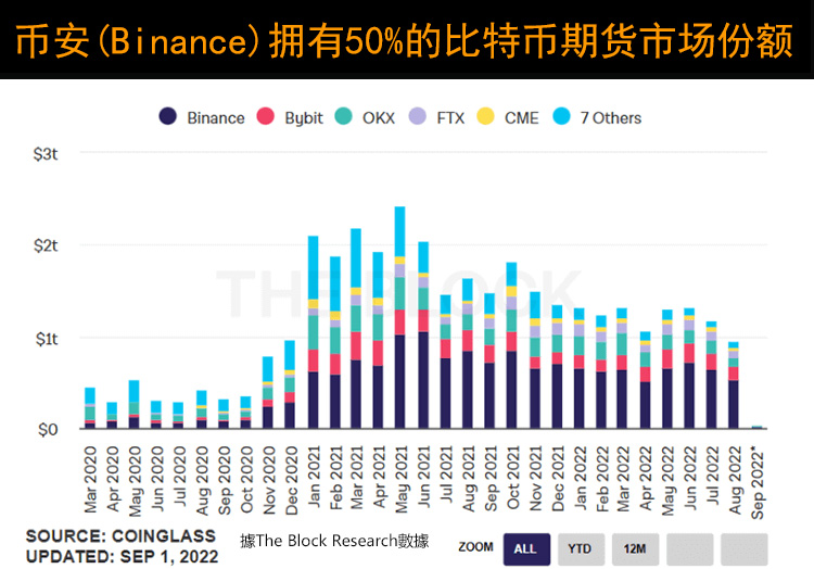 根据The Block Research数据币安交易所在全球拥有50%的比特币期货市场交易份额。其他依次是Bybit、OKX、FTX和CME等。