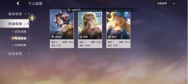 2、之后点击左侧的对战信息-常用英雄,就可以查看英雄的战力多少了。