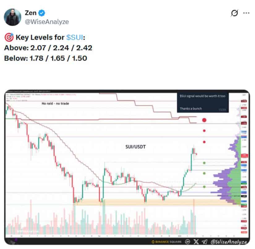 SUI正处于明确区间内交投,阻力位分别位于2.07美元、2.24美元和2.42美元,关键支撑则位于1.78美元、1.65美元和1.50美元。来源:@WiseAnalyze via X