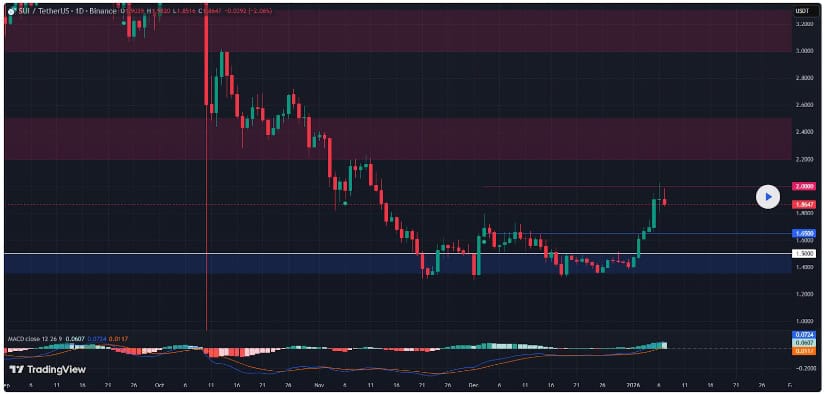 从技术面看,1.78美元附近四小时K线的多次反应凸显该价位为即时支撑。其下方历史价格结构在1.65美元和1.50美元附近设置了额外下行参考点,这些区域曾持续吸引买盘。在SUI/USDT TradingView图表中,自新年涨势以来动能已减弱,表明市场正从扩张转向盘整而非彻底趋势逆转。