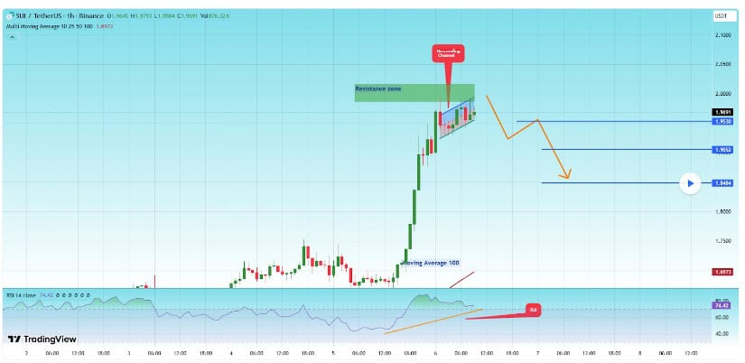 SUI正沿一小时上升通道运行,接近超买区RSI上轨,同时2.00美元附近强劲支撑仍是潜在反弹区。来源:CryptoAnalystSignal on TradingView