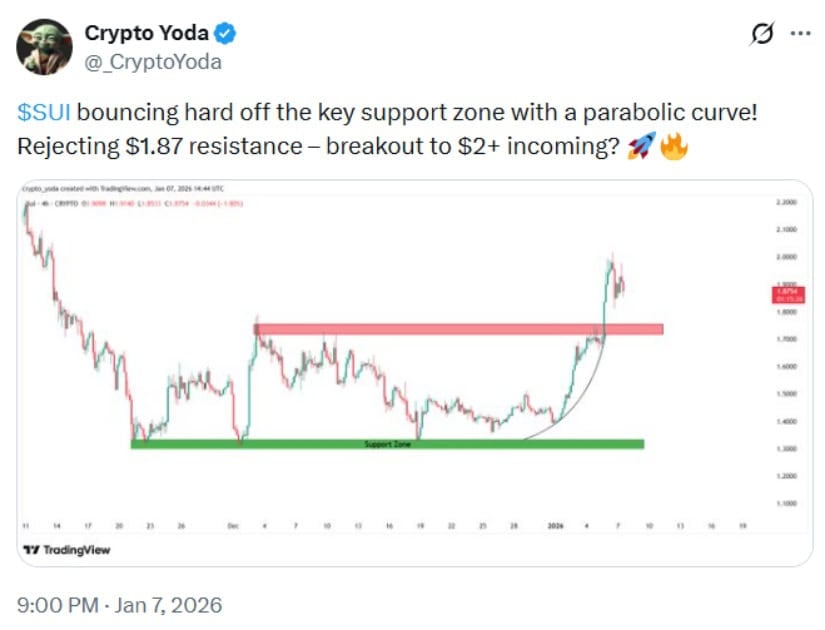 SUI正从关键支撑位强势反弹,面临1.87美元阻力,潜在突破2.00美元或将来临。来源:@_CryptoYoda via X