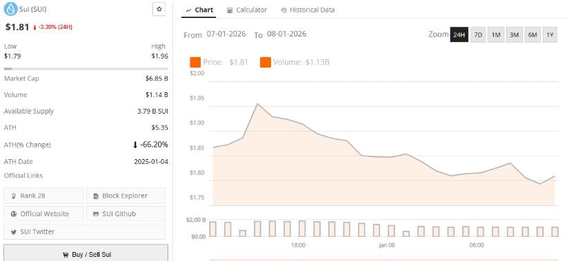 截至2026年1月8日,CoinMarketCap数据显示SUI价格交投于1.81美元附近,日内波动较本周早前的高活跃度有所缓和。市场参与者正密切关注SUI能否守住该基础位,并产生足够成交量以挑战上方阻力位。