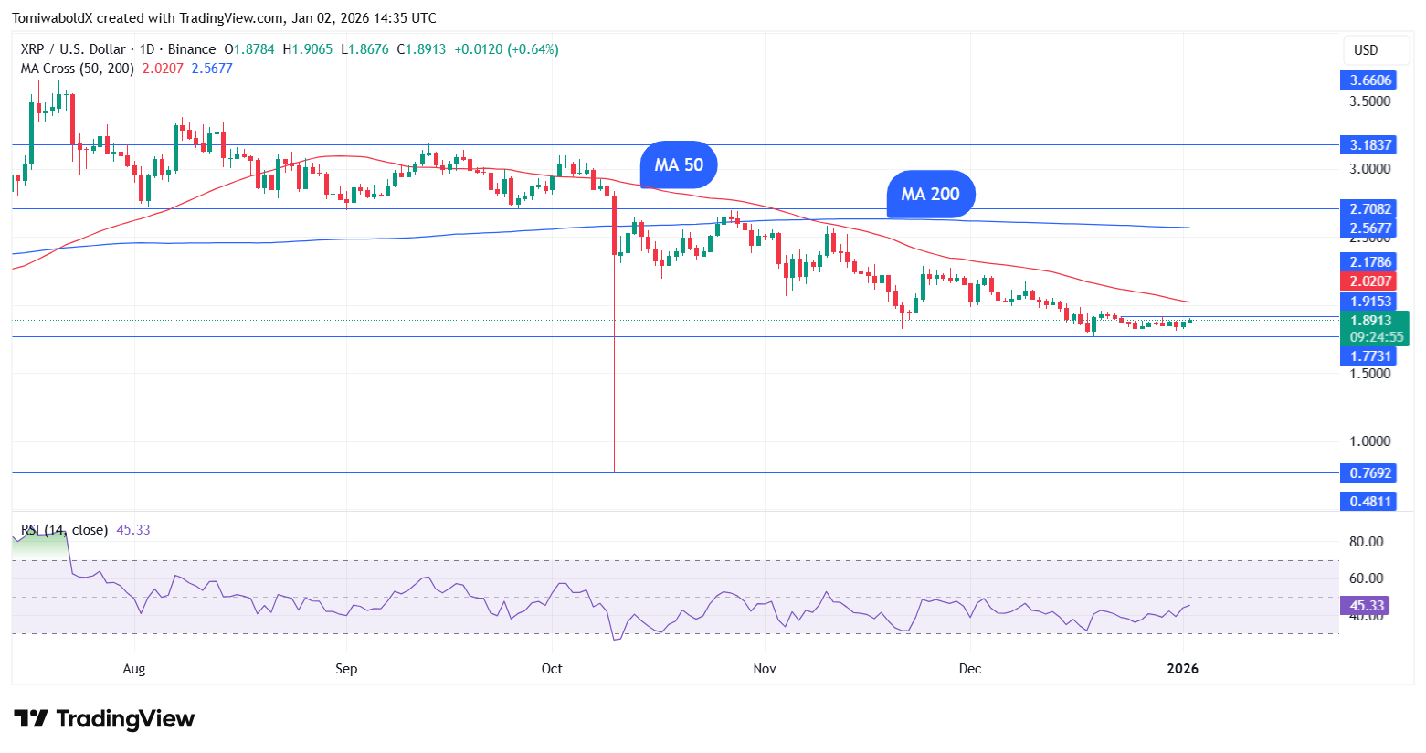 近期走势似乎是在更广阔顶部区间内的有限反弹。每当接近1.90美元区域时,XRP涨势屡屡受阻——该价位与2美元关口前的宽幅阻力带高度重合。此处尤为关键,因为近期多次冲击2美元的尝试均迅速失败,使其转化为卖方获利了结的供给区。