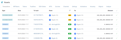 区块链数据显示,本次释放通过三笔主要交易在1月1日短时间内完成。新年钟声刚过,3亿枚价值约5.52亿美元的XRP率先解锁并转入标记为Ripple(28)的钱包地址rMhkqz。随后,另有2亿枚(价值3.68亿美元)XRP紧随其后进入同一钱包,使得Ripple(28)在数秒内接收了总计5亿枚XRP。