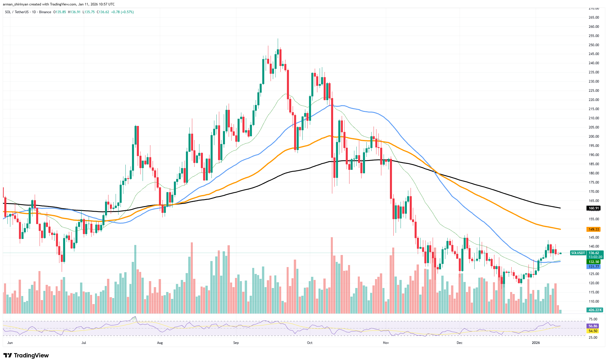 仅凭未平仓数据就足以证明Solana并非被遗忘的资产。价格方面,SOL虽未形成趋势性上涨,但技术面正处于修复阶段。在从200美元上方暴跌后,SOL于120美元低点筑底并稳步回升,当前反弹呈现克制性特征而非狂热状态。