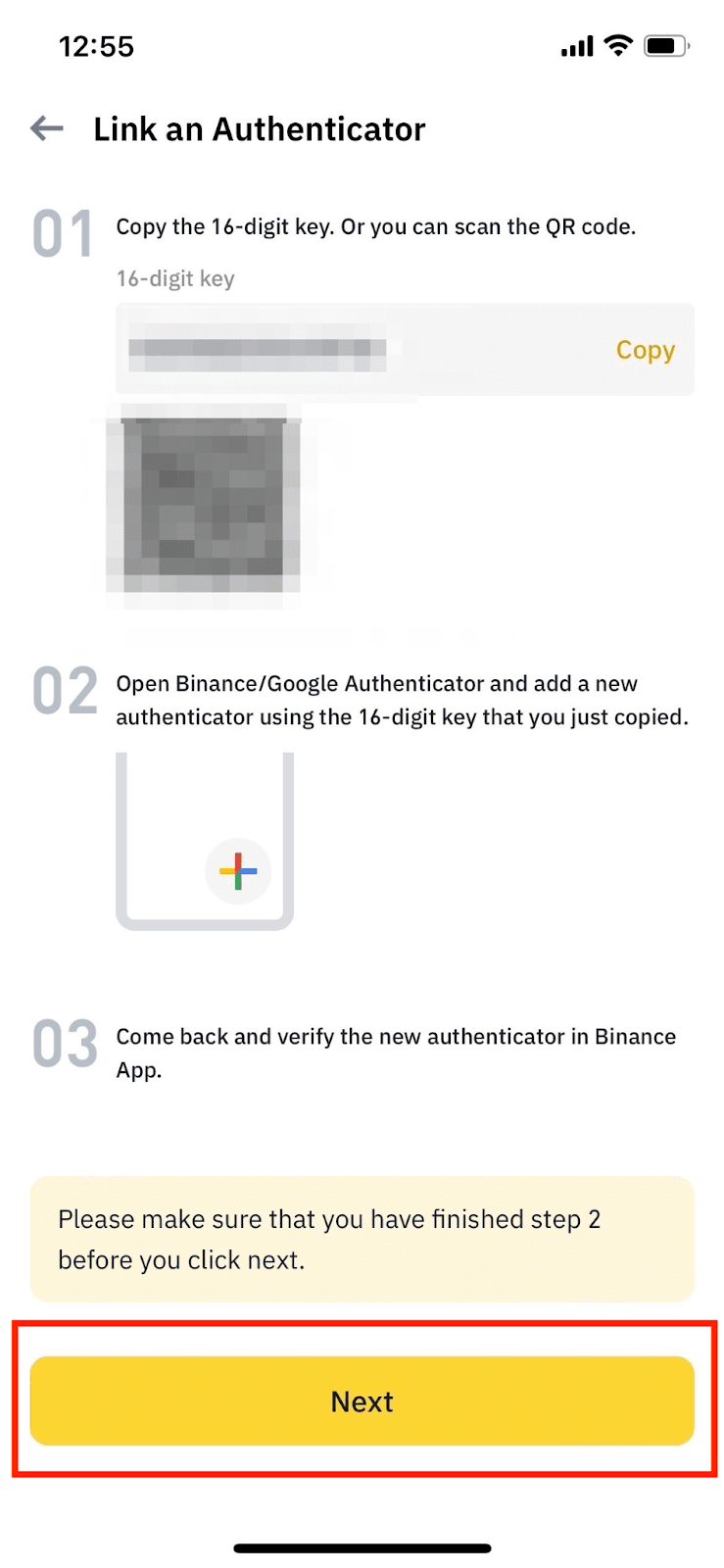 3.系统将显示一个二维码和设置密钥。复制该设置密钥。在BAuthenticator设置完毕之前,请勿点击【下一步】。打开您的币安验证器App,然后点击【扫描二维码】扫描相应的二维码。如无法扫描,请点击【输入设置密钥】手动输入设置密钥码。您将看到一个名为“Binance.com”的新账户已添加至您的币安验证器。