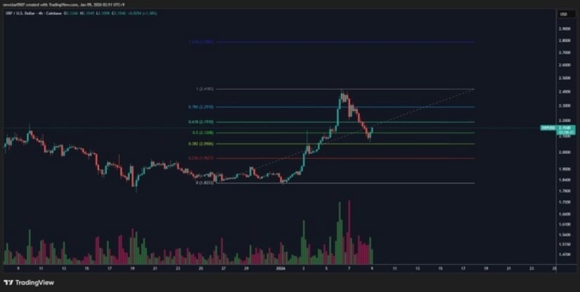 市场评论员CW(@CW8900)分享的技术分析指出,基于1.618斐波那契扩展位测算,2.78美元成为下一个关键上行目标。该预测以四小时K线为基准,锚定2024年12月0.62美元摆动低点与2025年1月2.30美元高点绘制。