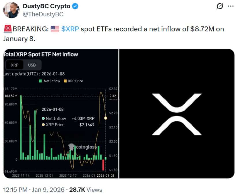 "重磅:1月8日$XRP现货ETF净流入872万美元",推文强调。