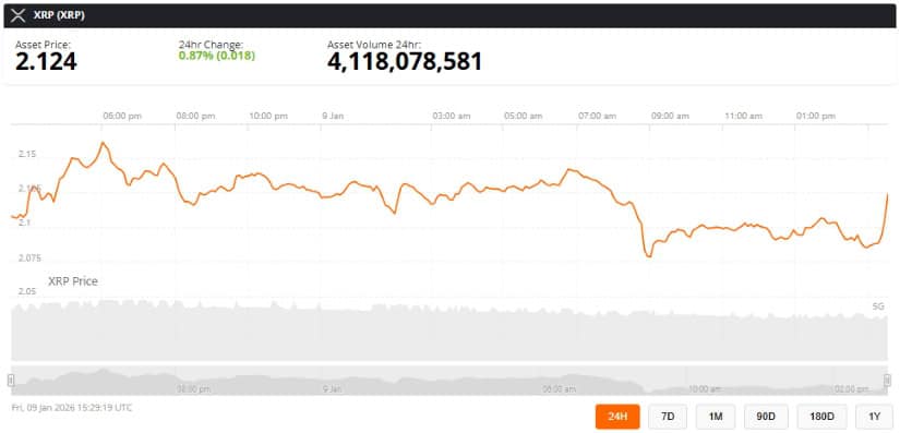 截至发稿,XRP报2.12美元,24小时上涨0.87%。来源:Brave New Coin