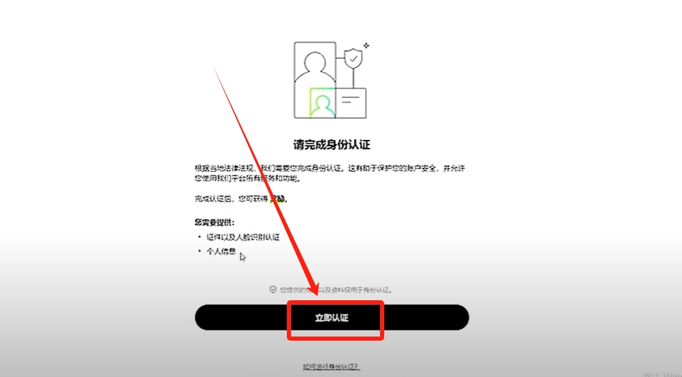 这里可以看到只有完成身份认证,我们才可以使用它们平台所有的功能和服务,并且获得奖励。身份认证需要提供我们的证件以及人脸识别,还有个人信息。如果你在中国你就需要身份件,在电脑上的话你需要一个摄像头来进行人脸识别,如果你是在手机上,只需要身份件就可以直接进行认证了。我们点击【立即认证】。