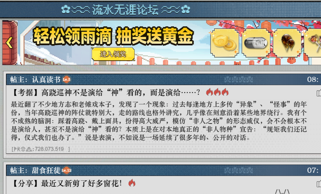 2、活动期间,完成3.4版本资讯浏览、好友组队等任务可获取对应抽奖次数,奖池包含周大福黄金吊坠、游戏周边、纯雨滴、养成材料等丰厚礼品,奖池内容有限抽完即止。
