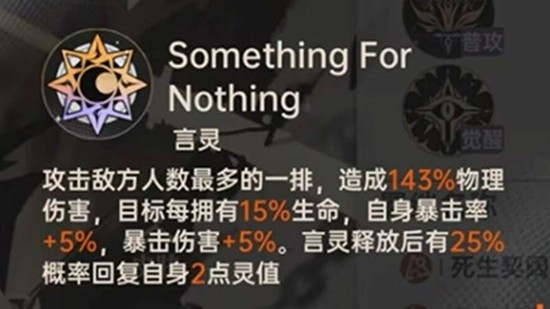 他在游戏中的定位是中排物理攻击型言灵师,其核心输出技能名为“Something for Nothing”,这个技能不仅拥有高额的基础伤害倍率,还具备独特的判定机制:目标的当前生命值越高,路明非触发暴击的概率就越显著。此外,每次释放该技能时,还有25%的概率恢复2点灵值,这能有效缓解资源压力,强化他的技能循环节奏。