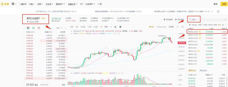 6、在左侧搜索框中搜索BTC,选择BTC/USDT,就可以看到BTC的实时行情: