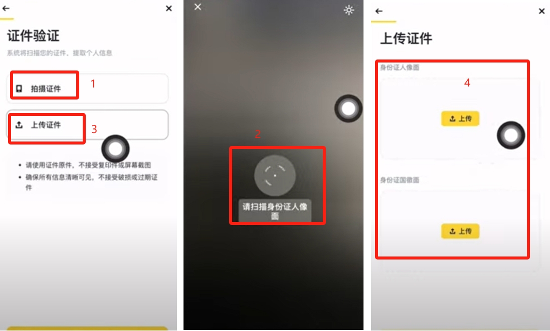 验证证件有两个选项,你可以选择拍摄证件,也可以选择上传证件。拍摄证件就是直接扫描你的身份件的正面和反面就好了。上传证件就是提前拍摄你的身份件的正面和反面,然后分别进行上传就OK了。