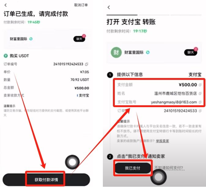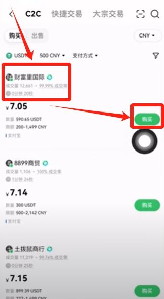 通过C2C交易区选择USDT购买,输入金额后系统自动匹配优质商家。优先选择成交量破万且好评率99%以上的商户,支持微信/支付宝/银彳卡多种支付方式。