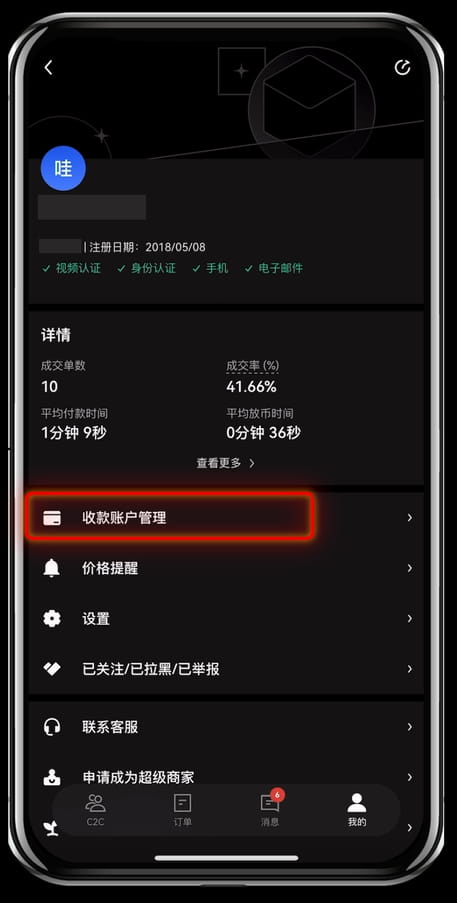 8. 在右下角【我的】页面中选择【收款账号管理】。
