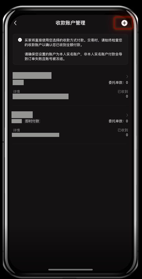 9. 点击右上角"+"号添加新的收款方式。