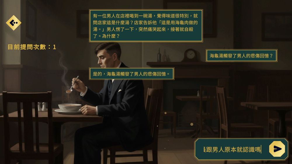 团队指出,《沙发侦探》打破了传统海龟汤必须寻找人类主持人才能进行游戏的门槛,在游戏中,AI 将担任全知全能的汤主,玩家不再需要等待朋友有空或四处凑团,随时都能展开一场高品质的推理。AI 能即时理解玩家的自由提问,依据逻辑判断回答「是」、「不是」或「与此无关」。有别于以往这类推理游戏只能透过选择关键字或固定选项来拼凑提问,团队强调本作实现了完全自由的自然语言输入,玩家不受限于系统预设的词彙,无论是天马行空的假设或是刁鑽的细节确认,AI 汤主都能理解语意并给予判断,还原了海龟汤最核心的对话推理乐趣,让单人游玩也能享受到如同与真人互动般的临场感。