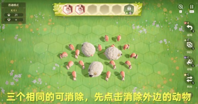 三个一样的可以消除,要先消除外边的动物;