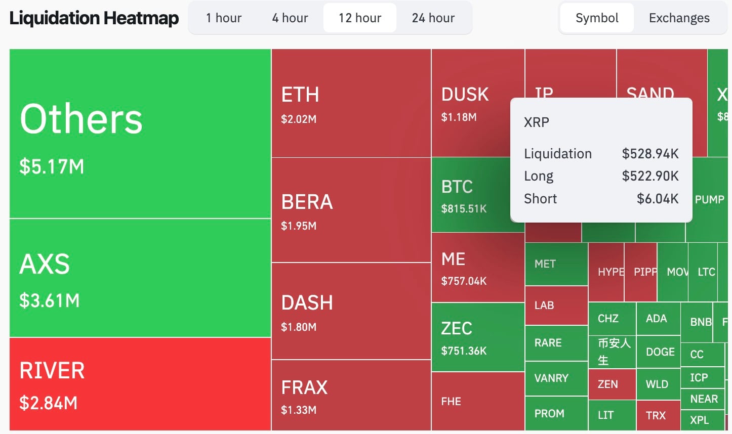 过去12小时内,XRP爆仓金额达528,940美元,其中多头爆仓占比高达522,900美元,数据令人震惊。根据CoinGlass统计,空头爆仓仅6,040美元——多空爆仓比例失衡达到惊人的8,700%。作为对比,同期比特币爆仓总额为815,000美元,但多空分布相对均衡;以太坊爆仓202万美元,双方均有显著损失。