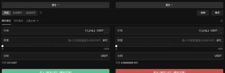3. 默认显示手动交易模式,操作前需先进行资金划转,将主账户资产转入借币账户作为保证金。