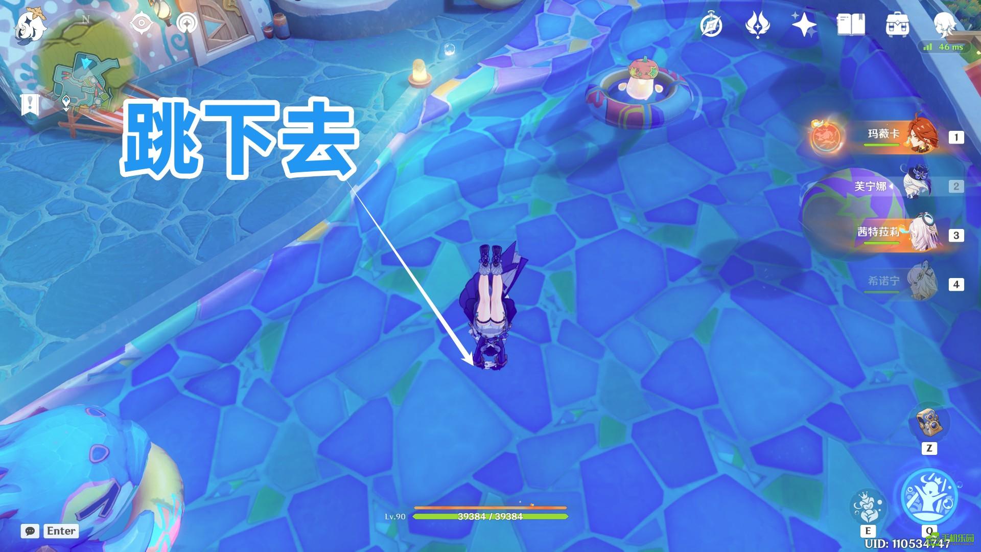 来到「呼呼丘」传送点二楼,就是剧情旅行者住的房间门口,能看见一个泳池和跳台。