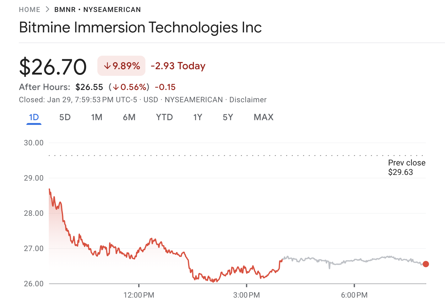 与Strategy类似,BitMine股票(BMNR)周四收跌9.89%至26.70美元,创2025年11月以来新低。