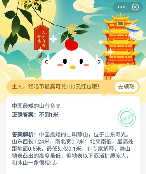 支付宝的小鸡答题中,问到各位小伙伴一个地理方面的问题,中国最矮的山有多高?可能大家都会知道最好的山有多高,那么最矮的山知道有多少米吗?今天就带领大家一起增加一下小常识吧。一起看看正确答案。