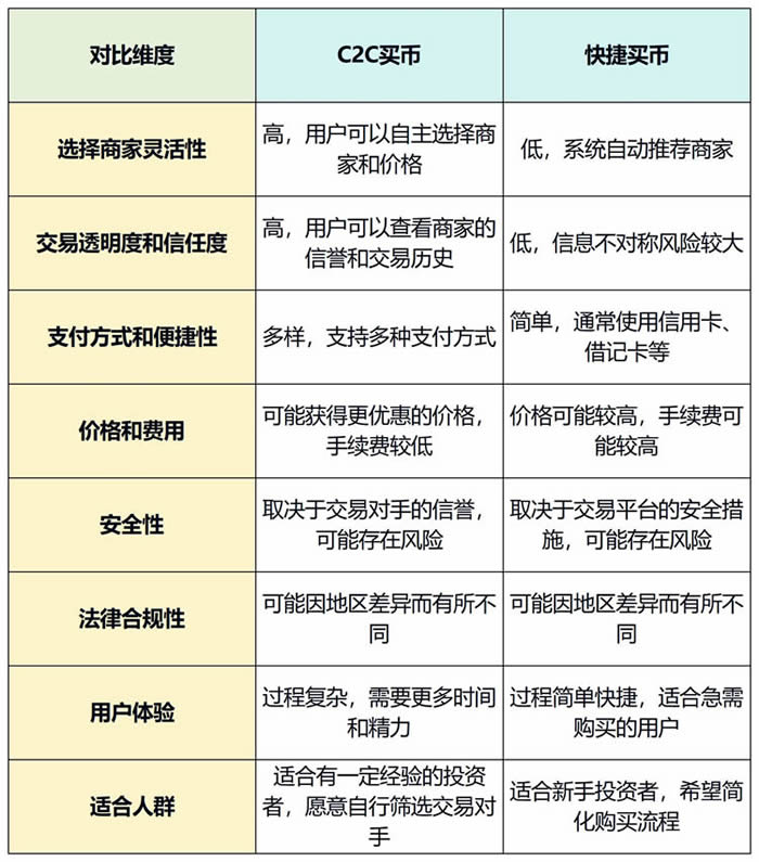 快捷买币通过平台信用背书完成交易,虽然操作便捷但缺乏个性化风控手段。用户无法直接核查资金流向和商户资质,需完全依赖平台的安全保障体系。