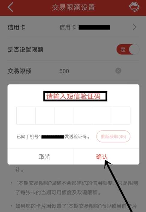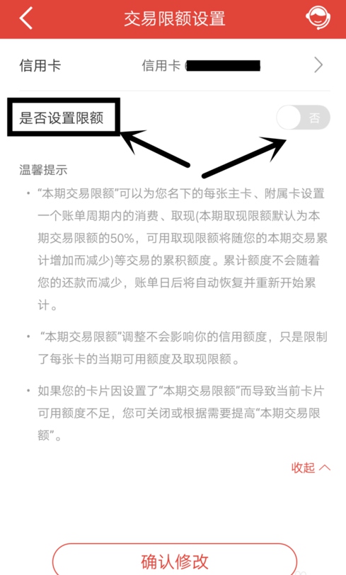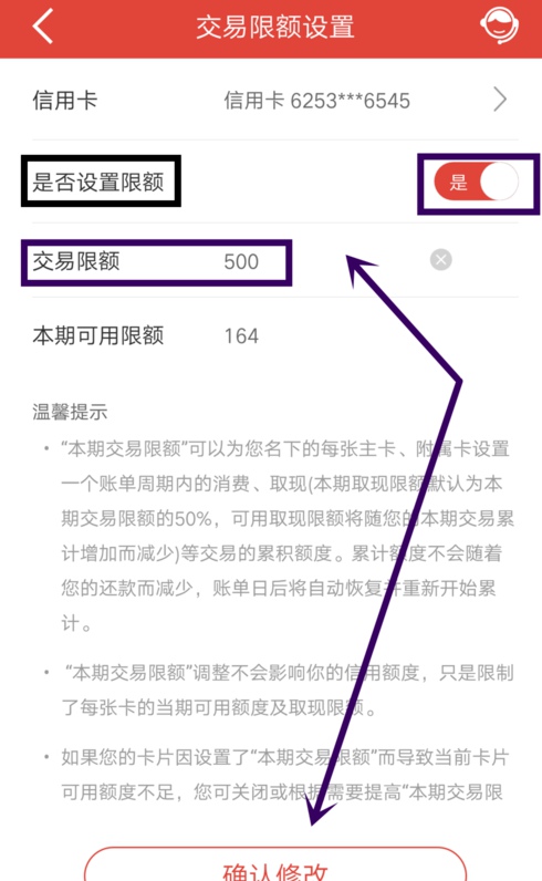 5.开启限额开关后,输入交易限额如500,然后点击下面“确认修改”即可