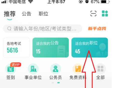 在公考雷达首页,点击以下位置处的【适合我的职位】