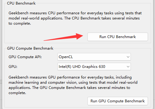 下面就是测试功能了,“cpu benchmark”就是cpu测试,点击“run cpu benchmark”就能开始测试cpu;下面的“gpu compute benchmark”就是gpu测试,点击“run gpu compute benchmark”就是开始gpu的测试。