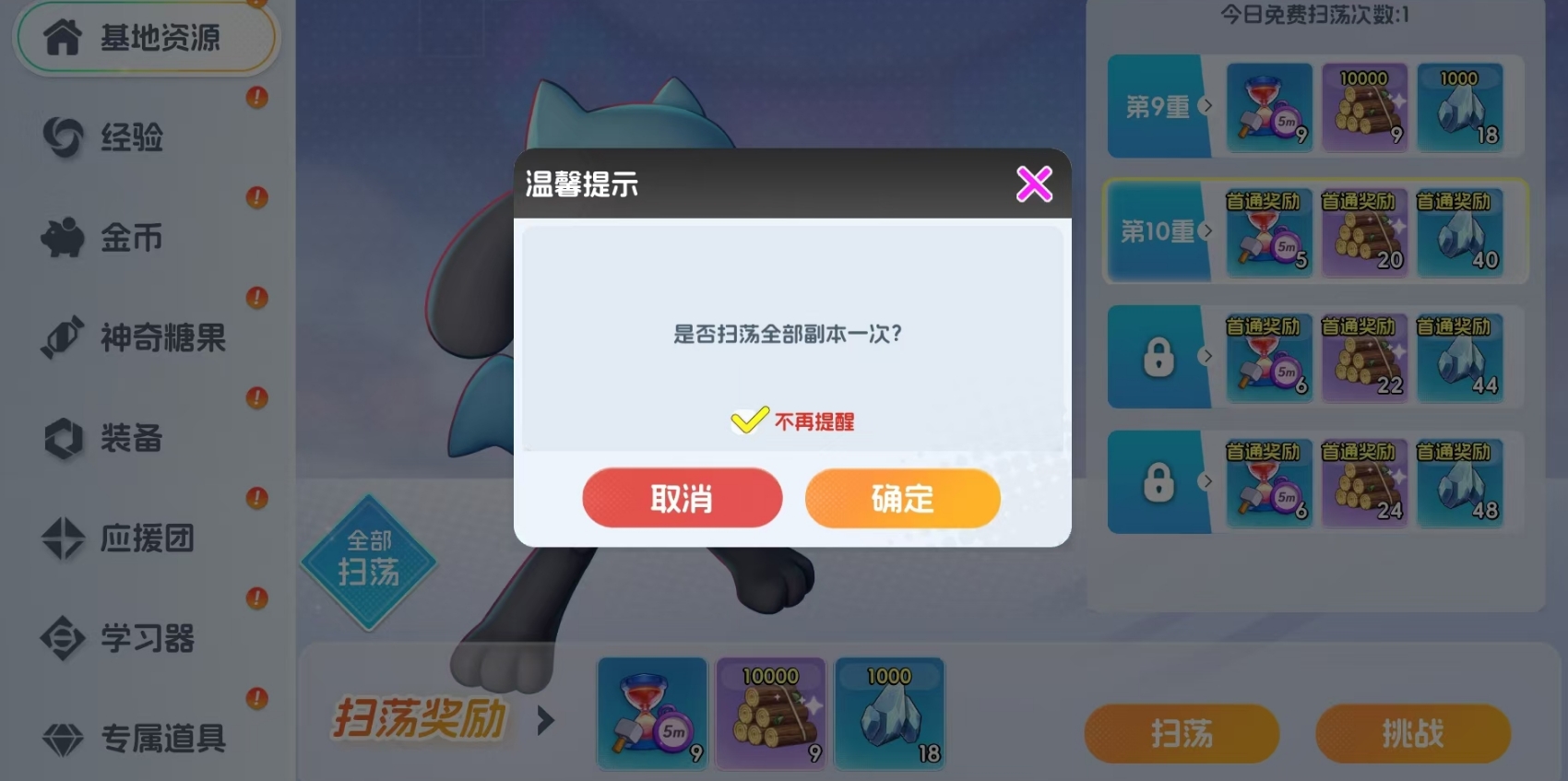 任一关卡首次通关后即开放扫荡功能,且仅支持对已通关的最高难度节点进行扫荡——系统自动识别并执行,无需手动指定。每类资源关卡每日限扫荡两次,次日零点重置次数。为最大化资源收益,推荐在离线前优先挑战更高难度关卡,确认通关后再启动扫荡;此外,游戏内置“一键全扫荡”功能,可同步完成全部资源线的当日扫荡操作,大幅提升日常效率。