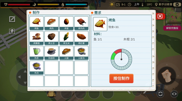 食物补给是持续生存的前提。游戏内设有多元化采集路径:垂钓操作稳定、产出可控,适合新手建立初期食物储备;野外可采集蘑菇、土豆、玉米等可食用植物,分布广泛且无需复杂前置条件。所有食材经烹饪加工后,饱腹值显著提升,且能规避生食带来的腹泻、中毒等负面状态。火堆为烹饪必要设施,制作烤鱼需木棍+鱼,烤肉则需对应肉类及燃料,材料齐备后于火堆旁交互即可完成制作。