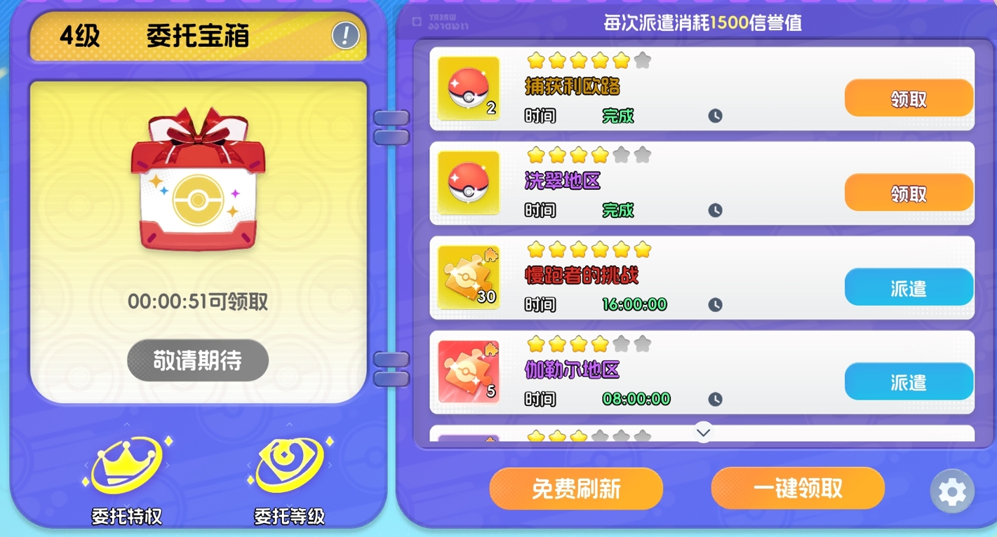 执行派遣任务流程简洁:选定目标委托后,指派一只已拥有的宠物参与即可。任务将在设定时间后自动完成,届时可领取对应奖励。每次派遣固定消耗1500点信誉值。该数值可通过常规玩法稳定获取,包括推进主线关卡、离线挂机收益、日常副本结算等,整体产出量充足,基本不会构成使用限制。