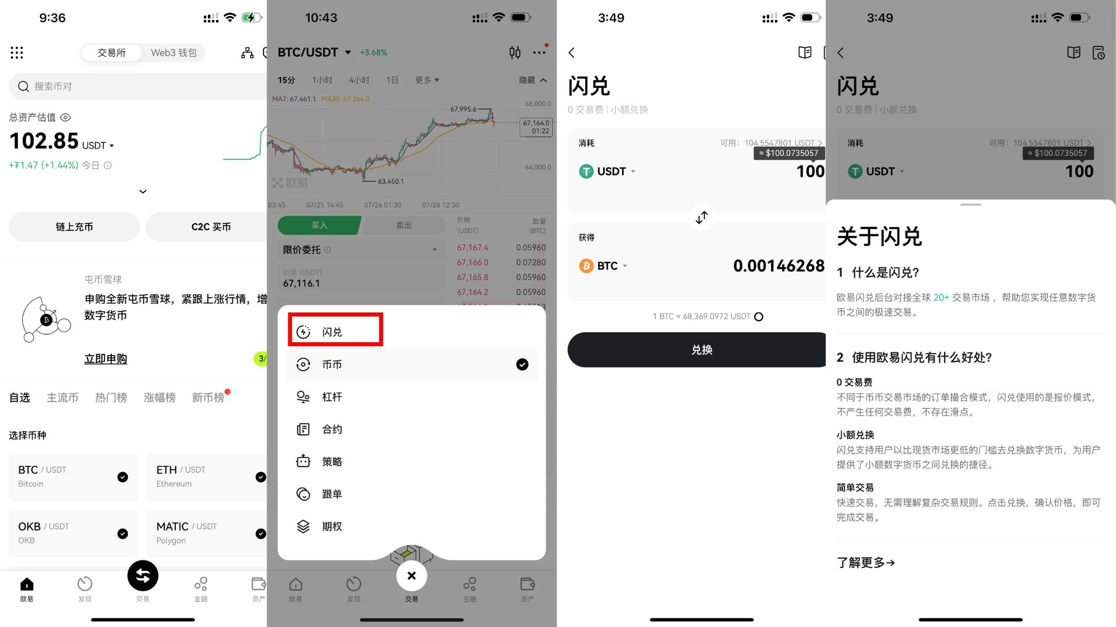 闪兑 - 加密货币互相兑换,比如BTC,ETH,USDT,类似于换汇,适合小额加密货币的快速兑换,如果你是想要通过币圈赚取收益,不建议大家直接闪兑。