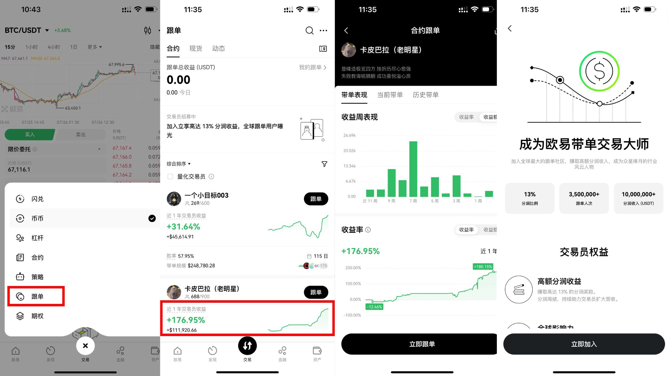 跟单 - 跟着其他交易者的交易策略进行操作。你可以看到其他交易员的收益率情况,点击跟单然后查看详细的收益信息,如果满意可以点击立即跟单进行投资,如果你是资深投资者,也可以加入欧易带单大师来分取带单利润。