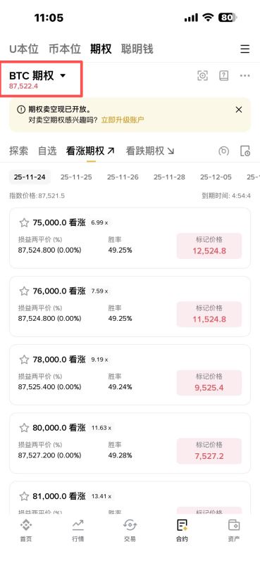 搜索“BTCUSDT期权” → 选到期日(e.g. 1周后) → 看Call行权价链。
