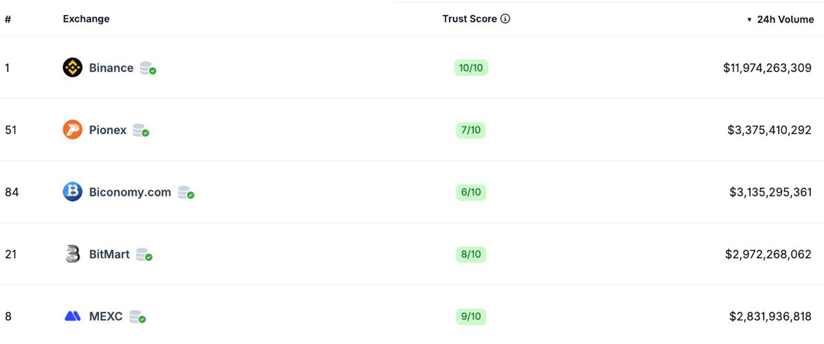 截至周五按交易量排名前五的加密交易所。来源:CoinGecko