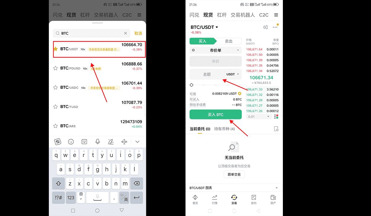交易其他加密货币:这是最主要的目的。进入“交易”>“现货交易”(或“标准版”),在交易对中搜索你想购买的币种,如BTC/USDT,然后用你的USDT去购买BTC。