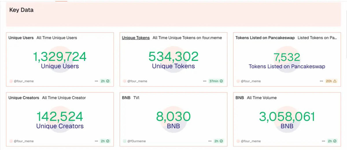 根据Dune数据面板,Four.Meme平台累计发行代币数量高达53.43万 枚,而其中能够成功“毕业”、进入Pancakeswap进行交易的仅为7,532枚,毕业率仅为1.4%。这意味着超过98%的项目在萌芽阶段就已夭折。