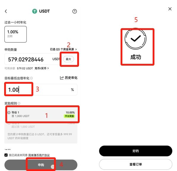 这里我们点击“最大”,勾选同意,“目标最低出借年化”我们可以填一下,比如1%,这样基本上都是一定会借的出去,都打好之后我们就可以点击【申购】。这样就申购成功了,有手就行,你不用其他操作,他就会把利息发给你。