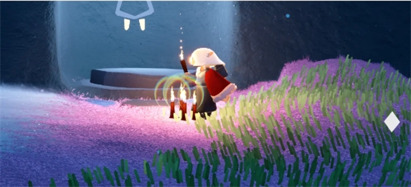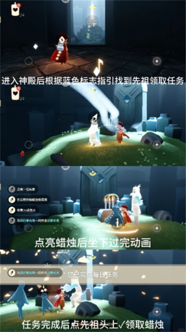 进入神殿后根据蓝色标志指引找到先祖领取任务,领取后点燃蜡烛坐下怀念先祖,动画结束后任务完成,点先祖头上✓领取蜡烛