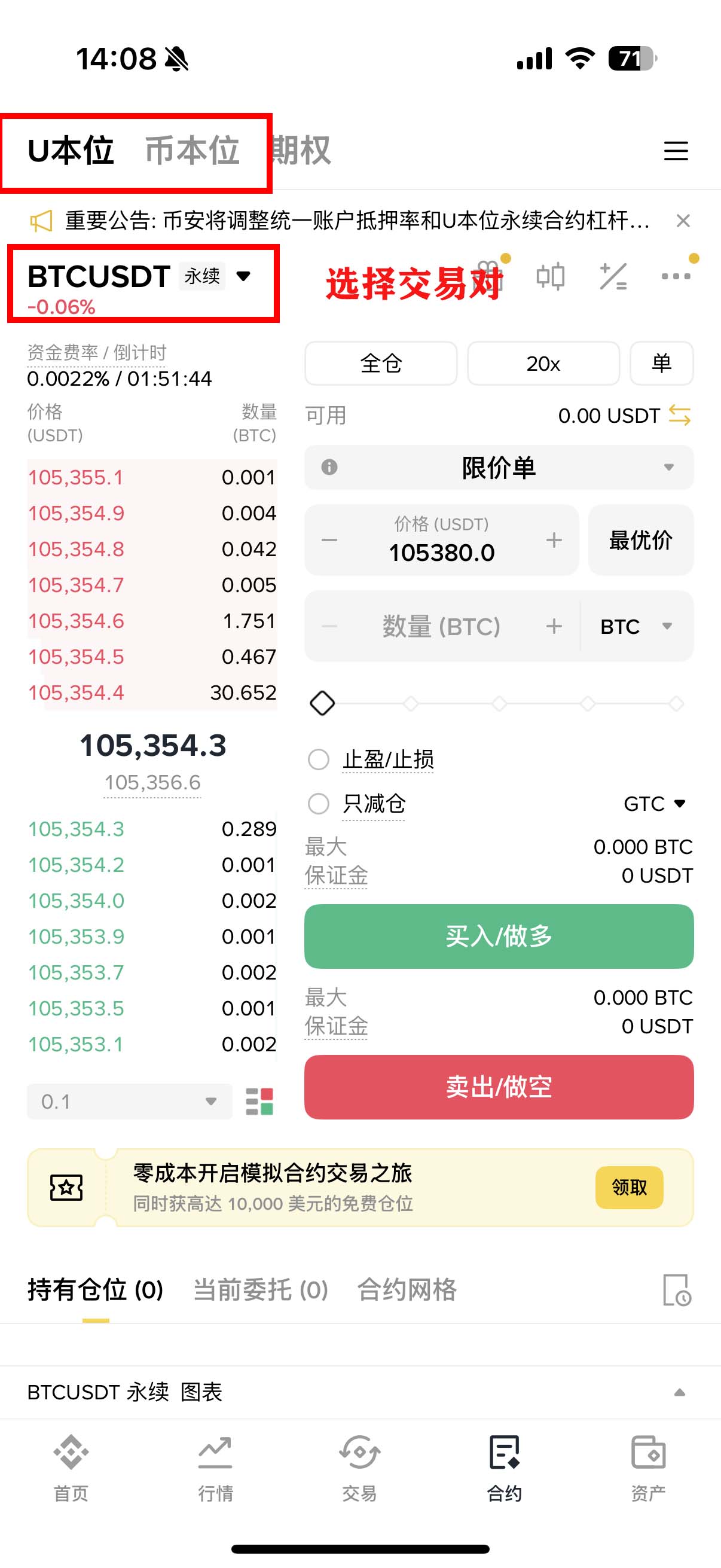 根据交易品种选择对应交易对,并确定U本位/币本位结算方式。