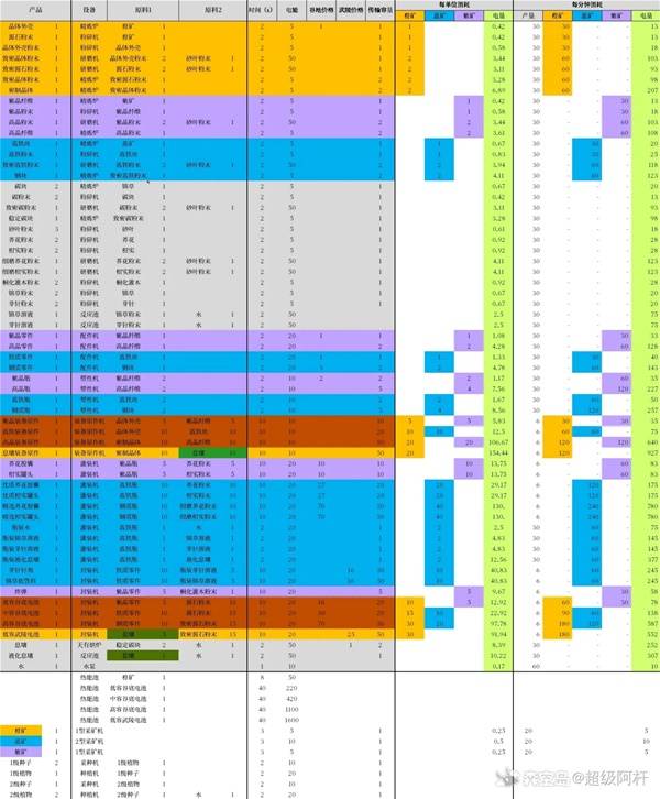 下表根据用3种有限矿产(橙、蓝、紫)进行了划分,棕色是需要复合矿产的产品。